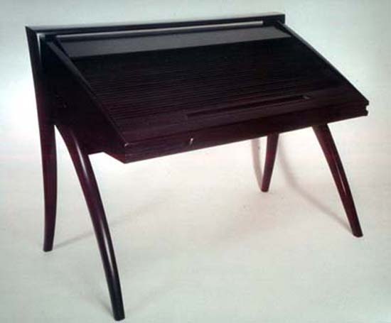 Ferrari Roll-top Deskis the most recent in a series of works that creates a abstracted stage set. In the Ferrari Roll-top Desk, the environment is created using gelled light as an aesthetic and conceptual element in the design. The exterior alludes to exotic sports cars as a point of departure and evokes a myriad of metaphors depending on the viewer. The tambour roll-top suggests a theatre curtain rising to reveal and disclose the mysterious environment within; one conducive to the activity of a personal desk, contemplative writing.