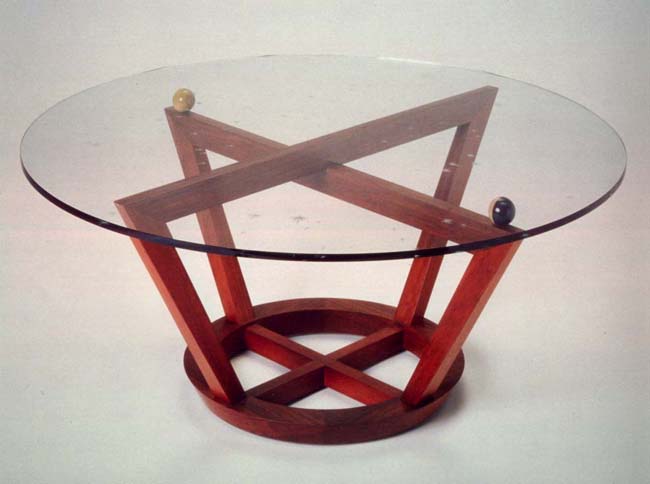 Mayan Ritual Table was inspired by a hieroglyph from the Temple of the Plumed Serpents at Xochicalco. The hieroglyph was thought to be the symbol of a sundial or an elementary measuring device that played a role in the delineation of time in their cosmology. I was captivated by the form integrating all three of the elemental forms, circle, triangle and square into one harmonious composition. I took this symmetrical, multi-elemental form and used it as a symbol for the ea.rth. I leveled the plane by using spheres representing the sun and the moon, deified in their cosmology (i.e. Temple of the Sun and Temple of the Moon). I represented the solar system by etching the northern, circumpolar constellation pattern into the glass table top.